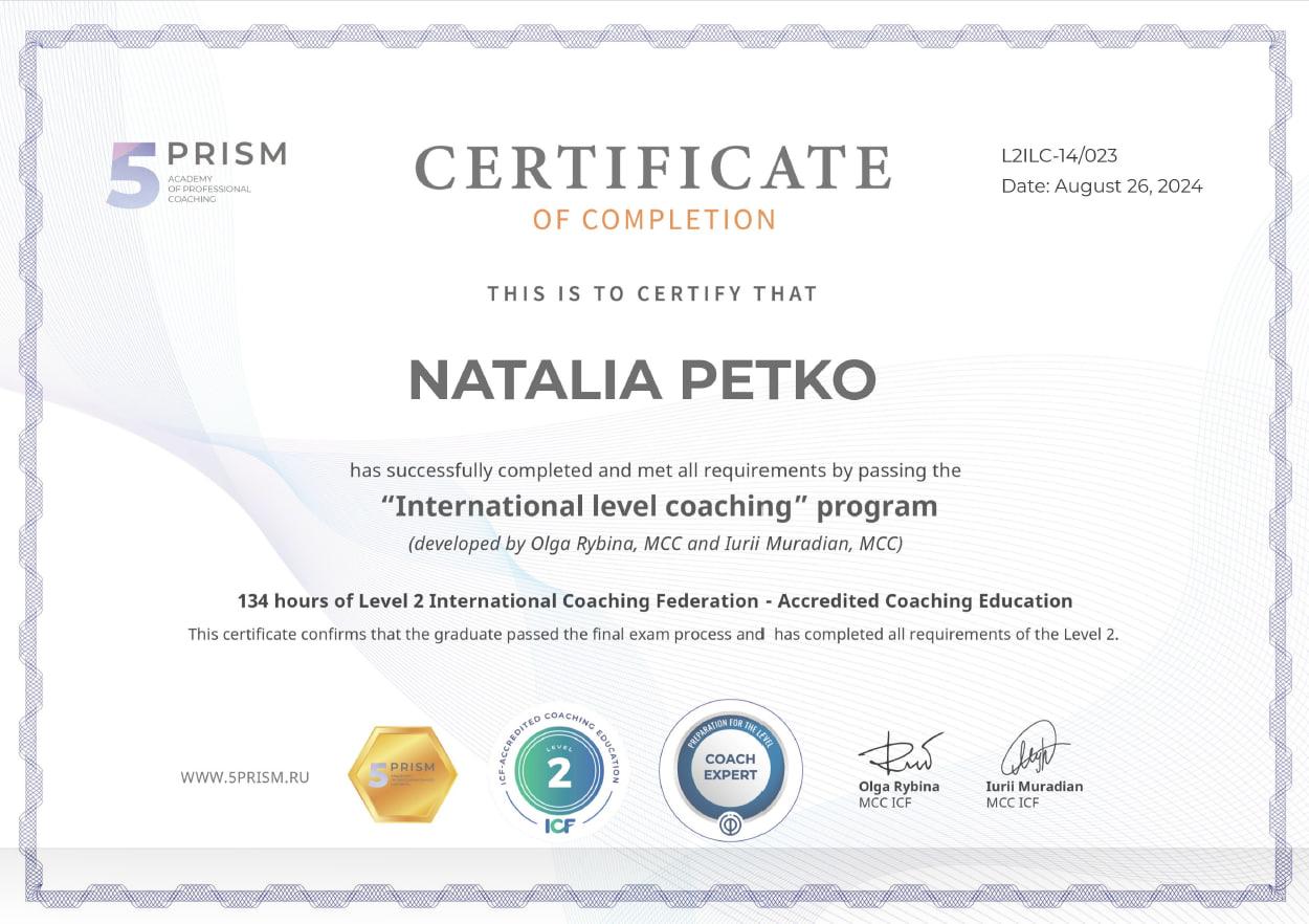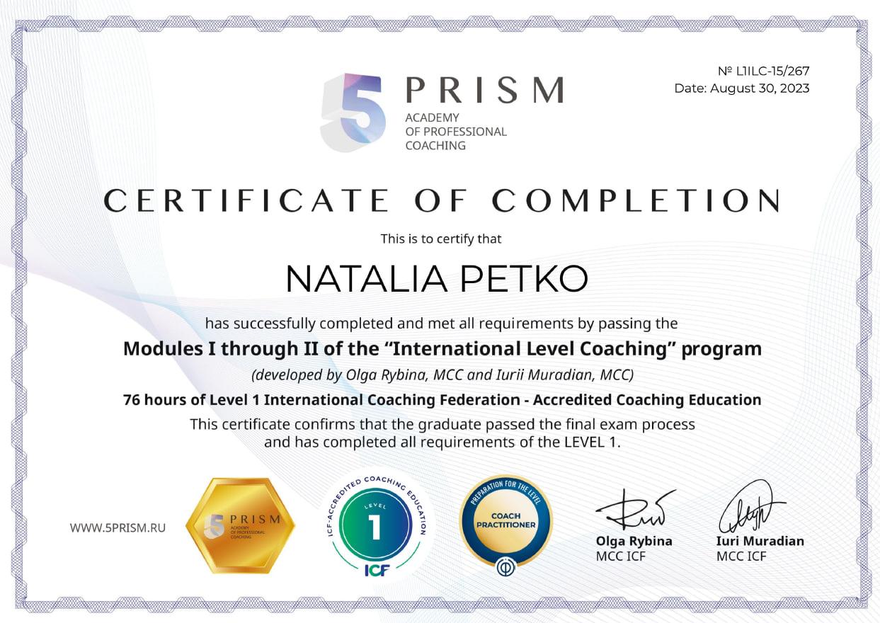 Отдельного внимания заслуживают сертификаты Академии 5 Prism. Её безупречная репутация подтверждена аккредитацией ключевых профессиональных сообществ: Международной Федерации Коучинга (ICF) и Федерации профессиональных коучей и наставников (ФПКиН).